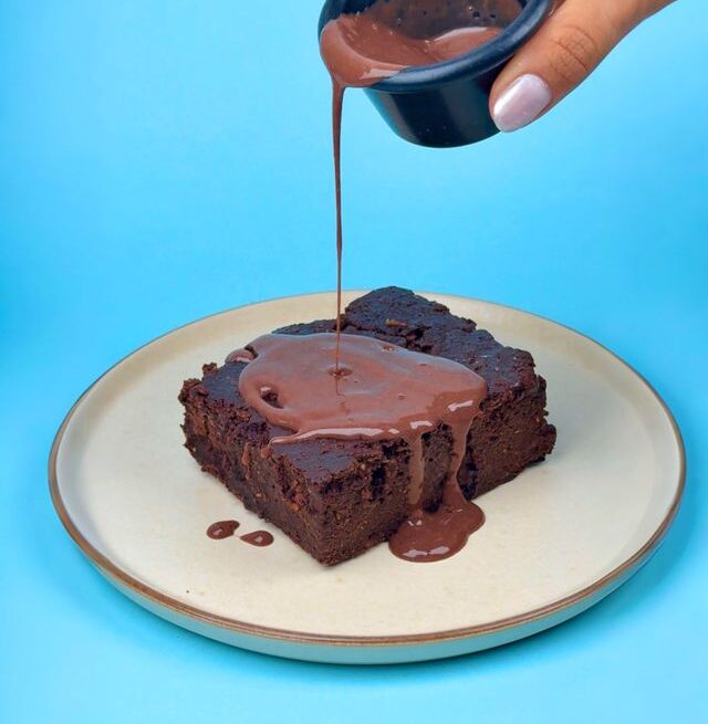Delicioso brownie chocolatoso a base de harina de avena, cacao en polvo, chocolate organico al 85%, castañas, stevia, panela, huevo y proteina aislada.