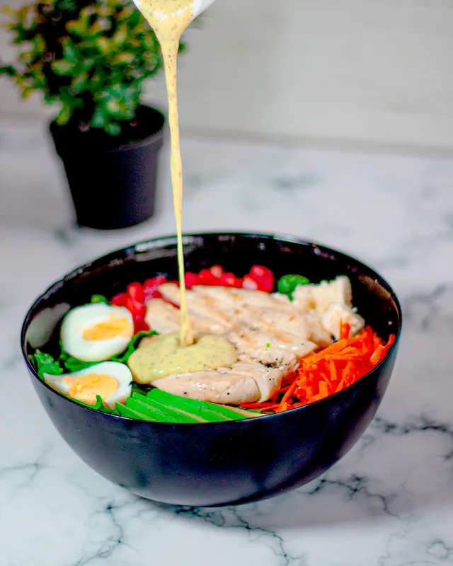 Nuestra ensalada de la casa, hecha a base de lechuga; palta; zanahoria; tomate; queso fresco light; huevo duro; filete de pollo a la plancha acompañada de nuestra salsa de yogurt.