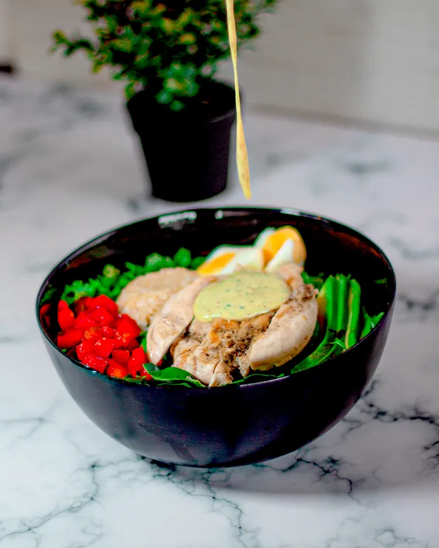 Deliciosa ensalada a base de 100gr de arroz integral; lechuga; espinaca; pimiento rojo; palta; huevo; filete de pollo a la plancha acompañada de nuestra salsa de yogurt.