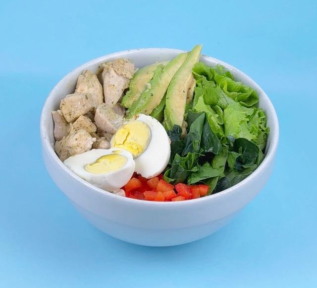 Deliciosa ensalada a base de 100gr de arroz integral; lechuga; espinaca; pimiento rojo; palta; huevo; pollo en cubos acompañada de nuestra salsa de yogurt.