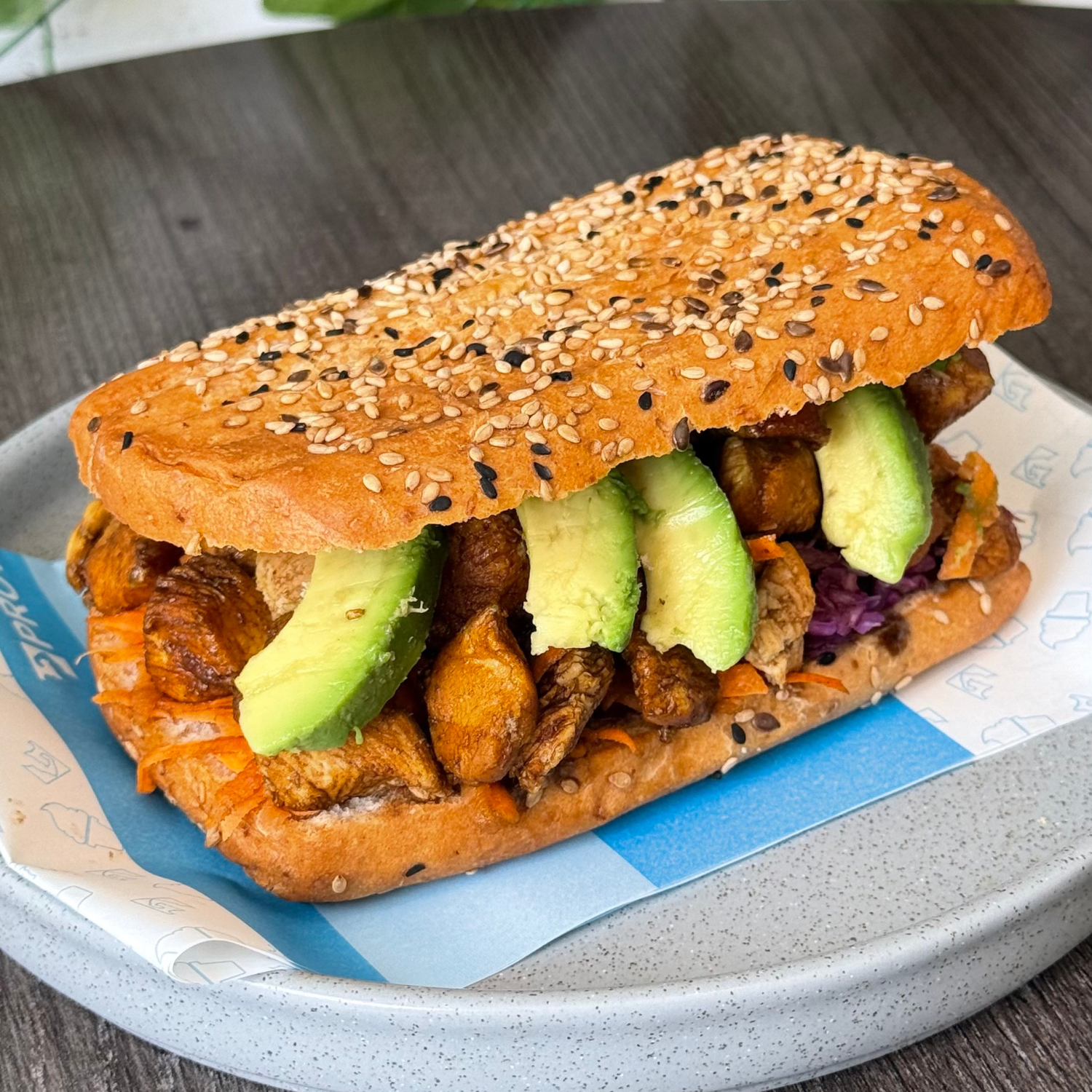Delicioso pan multigrano con relleno de pollo a la plancha en salsa teriyaki, zanahoria, col morada, palta y ajonjolí.